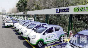 圖為位于地鐵1號線江陵路站大型停車場內(nèi)的杭城最大的“微公交”租賃站。站內(nèi)可停放80輛微型純電動(dòng)汽車,設(shè)充電座40個(gè)。記者李忠 攝