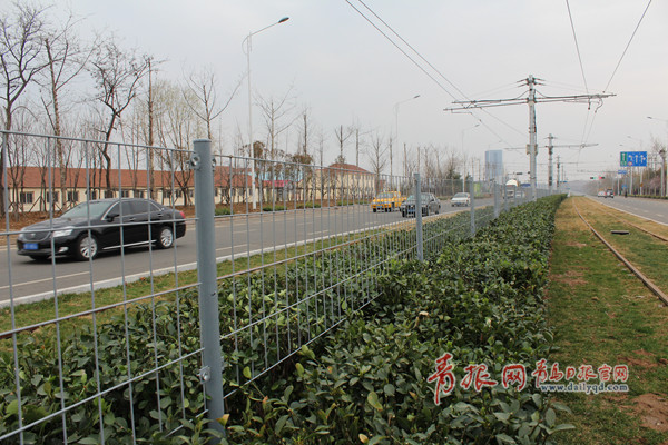 城陽(yáng)有軌電車線路安裝隔離帶,由隔離網(wǎng)和灌木組成