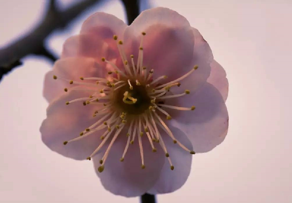 第三是梅花的姿。北宋林逋可謂寫(xiě)梅姿的第一能手,“雪后園林才半樹(shù),水邊籬落忽橫枝”,另一聯(lián)是“湖水倒窺疏影動(dòng),屋檐斜入一枝低”,均將梅樹(shù)特有的姿態(tài)——老干、疏影、橫枝寫(xiě)得入木三分。樹(shù)枝橫斜自如,花期沒(méi)有樹(shù)葉,花朵干瘦色淡,這是上蒼賦予梅的“天姿”,其他任何植物都無(wú)法相比。