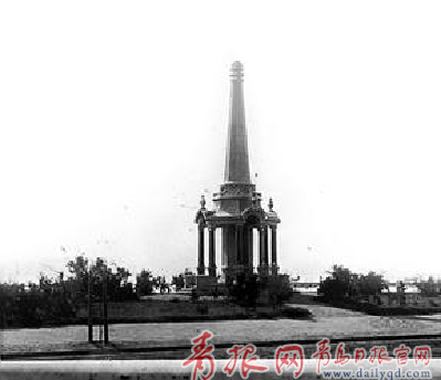 “葉世克紀(jì)念碑位于市政廣場(chǎng)南端,面向青島灣,共三層,用大理石砌造,碑座和碑體呈對(duì)稱的六邊形,碑體外環(huán)六根立柱,高丈余,為青島前海一景?!?