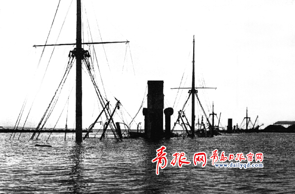 在要塞陷落前,德軍炸掉艦船封港(青島市檔案館提供)