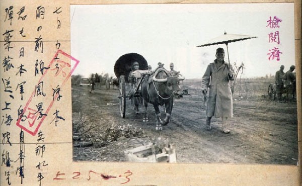 圖為1937年10月,幾名日軍士兵用從中國老百姓那里搶來的牛車往前線運送彈藥。這張照片起初蓋上了“檢閱濟”的印章表示可以發(fā)表,但在之后的審查中被判為“不許可”照片。