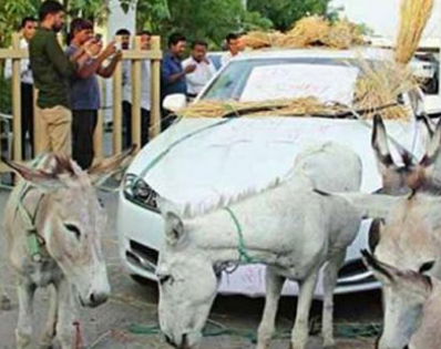 百萬豪車頻出問題 男子用4頭驢拉車游街抗議