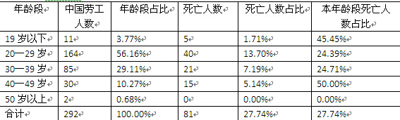 大夕張礦業(yè)所奴役中國(guó)勞工及勞工死亡人數(shù)年齡分段統(tǒng)計(jì)表