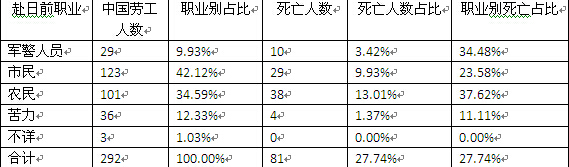 大夕張礦業(yè)所奴役中國(guó)勞工及勞工死亡人數(shù)職業(yè)類(lèi)別統(tǒng)計(jì)表