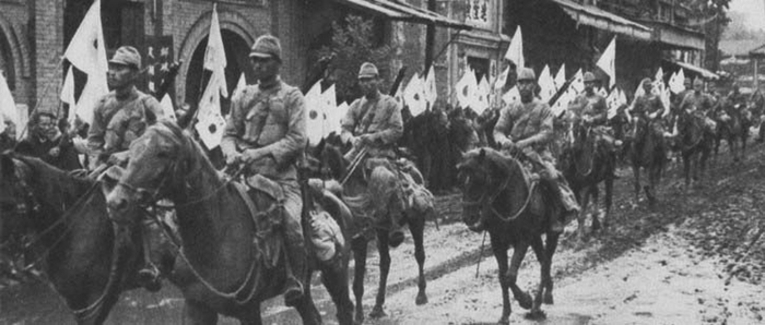 1937年9月25日,河北保定城陷落的第二天,市民手持日本國(guó)旗“歡迎”日軍入城的后繼部隊(duì)。