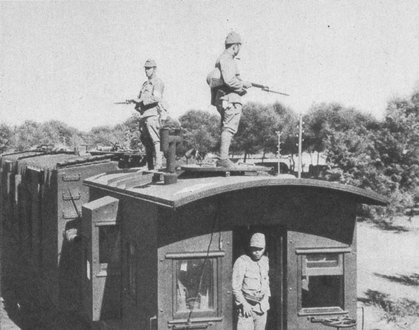 1937年10月5日,京漢線河北新樂(lè)段,軍用列車(chē)上戒備的日軍士兵。
