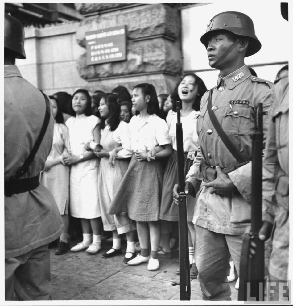 1948 年,交通大學(xué)學(xué)生的反美游行,秩序大亂,警察前來(lái)維持治安并拉起人墻,這兩位女生主動(dòng)退出這次游行。