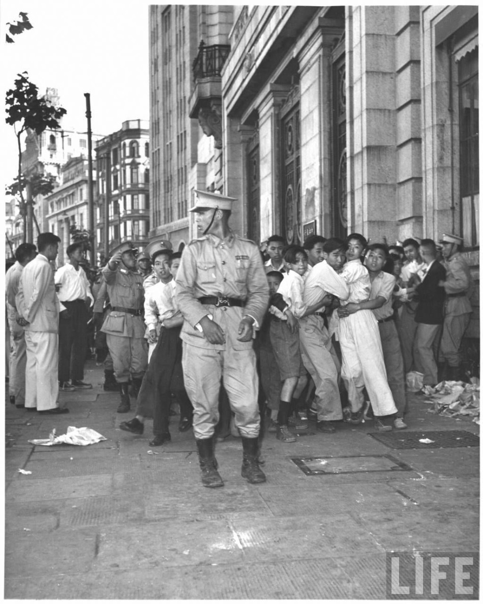 1948 年,交通大學(xué)學(xué)生的反美游行,這是在上海市中心的一處建筑物前,少數(shù)人抱成團(tuán),因?yàn)榫煸谝?guī)勸他們撤離。