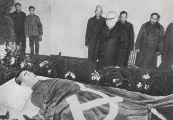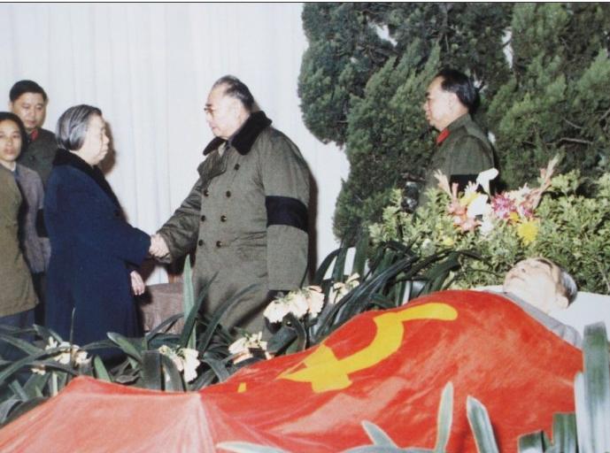 圖為華國鋒在周恩來遺體旁垂淚哀悼,他的身邊是王震將軍。