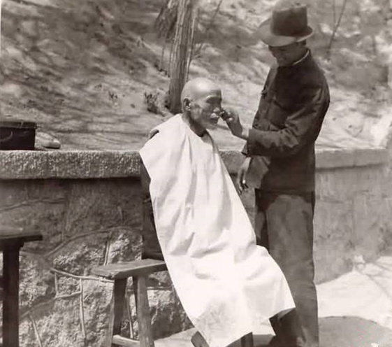 ?1940年代貯水山下老人正在理發(fā)。