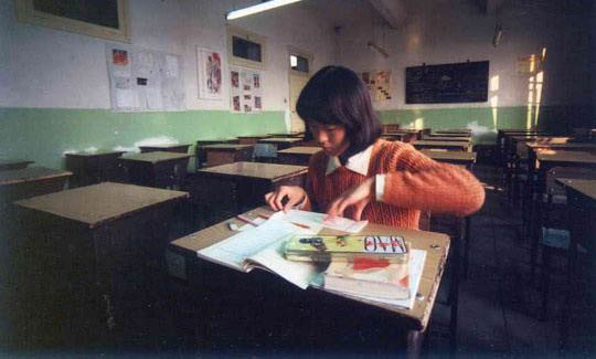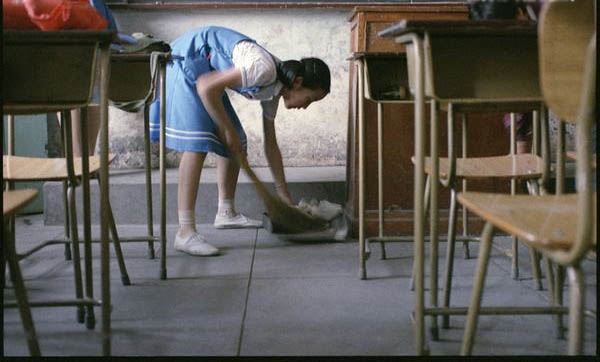 1986年4月,北京171中學(xué)教室,一位女學(xué)生在打掃衛(wèi)生。
