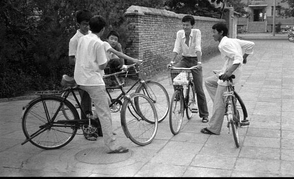 1985年8月,北京171中學(xué)校門口,幾個(gè)騎車少年在聊天。