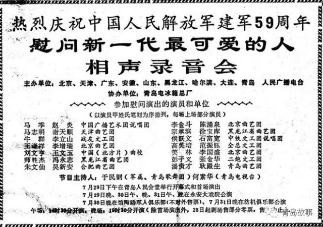 這次在青島舉行的“八一”相聲會的主辦單位是:北京、天津、廣東、安徽、山東、黑龍江、哈爾濱、大連、青島等廣播電臺,協(xié)辦單位是青島電冰箱總廠。7月29日下午在青島人民會堂舉行開幕式和首場演出,29日晚上和31日下午、晚上以及31日下午、晚上都在永安大戲院公演,30日晚在館陶路軍人俱樂部,31日晚在紡機(jī)俱樂部。短短的3天馬不停蹄地演出了8場,確實(shí)把這些相聲名家累得疲憊不堪。這14對相聲演員是:馬季和趙炎、馬志明和謝天順、侯耀文和石富寬、高英培和范振鈺、劉文亨和王文玉、王謙祥和李增瑞、李金斗和陳涌泉、笑林和李國盛、牛群和李立山、師勝杰和馮永志、彭子義和張金華、宗承濱和徐寶庫、朱文仙和吳新安,還有青島曲藝團(tuán)的潘貴才和耿殿生??芍^相聲人才濟(jì)濟(jì)一堂。演出主持人是青島歌舞團(tuán)的于民鋼和青島電視臺的何素華。