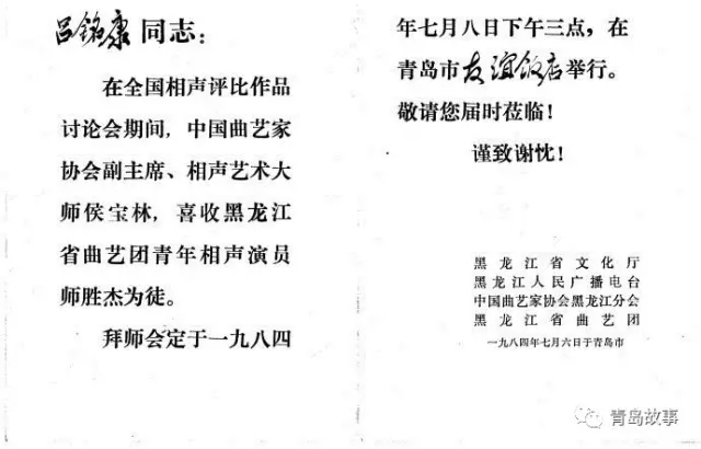 ?其間,侯寶林又主動(dòng)收時(shí)為黑龍江曲藝團(tuán)的時(shí)年31歲的師勝杰為關(guān)門弟子,筆者也收到了請柬,應(yīng)邀參加了7月8日晚舉行的拜師儀式。當(dāng)晚,青島友誼飯店宴會廳燈火輝煌,熱鬧非凡,共有20桌。相聲泰斗馬三立和出席全國相聲評比討論會的全體人員以及來自新聞界的朋友共200多人參加了師勝杰的拜師會,黑龍江省文化廳、藝術(shù)局還派人專程趕來祝賀。