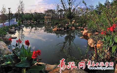 ????似是畫(huà)家的神來(lái)之筆,墨綠色的池塘外,添幾筆鵝黃做石頭,周?chē)@一圈明媚的綠,再在其中點(diǎn)上幾滴艷紅色,缺口處補(bǔ)上籬笆,為馬路安上路燈,遠(yuǎn)景是在淡藍(lán)的天空上暈染出的魚(yú)肚白。