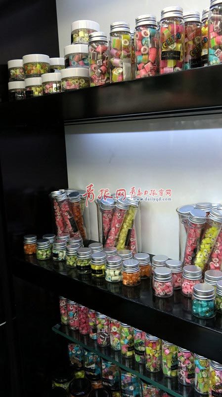 瓶裝的果味硬糖形狀皆為小小的圓柱,切面上綻放著惟妙惟肖的多彩圖案。蝙蝠、大嘴猴、數(shù)字、各種水果……令來往的顧客不僅贊嘆糖果師傅的精湛手藝。