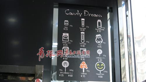 除了果味硬糖,此店還有棒棒糖等糖果售賣。門外的宣傳板上還提到,顧客可以根據(jù)自身需求,定做樣式獨(dú)特的糖果喲!