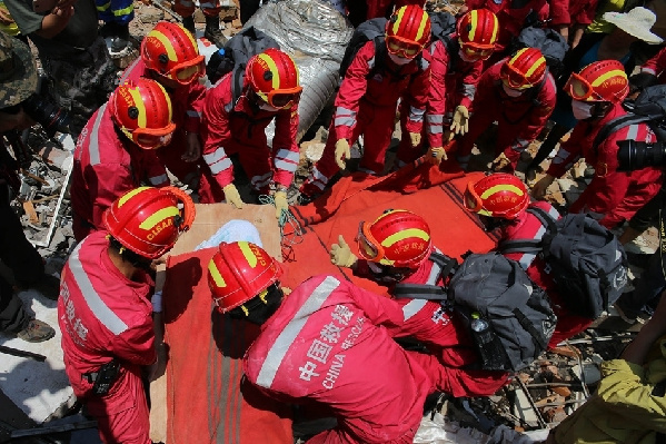 中國(guó)國(guó)家救援隊(duì)的救援人員現(xiàn)場(chǎng)救援