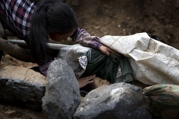 云南魯?shù)榭h龍頭山鎮(zhèn)營(yíng)盤村,地震中失去三歲兒子的普菊,摸著孩子的額頭,卻再也不能喚醒他。