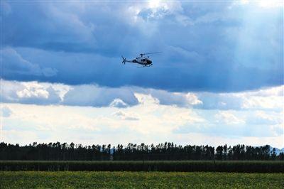 4日,哈爾濱市延壽縣青川鄉(xiāng)百合村,直升機(jī)在農(nóng)田上空盤旋搜索