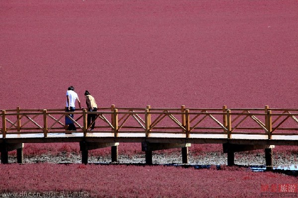 國內(nèi)最佳攝影旅行地:盤錦紅海灘。遼寧省盤錦的紅海灘一直是一大奇景,每年秋季,像是潑墨繪成的景色一般,氣勢(shì)磅礴。圖為游客在紅海灘國家風(fēng)景廊道釣螃蟹賞風(fēng)光歡度中秋佳節(jié)。