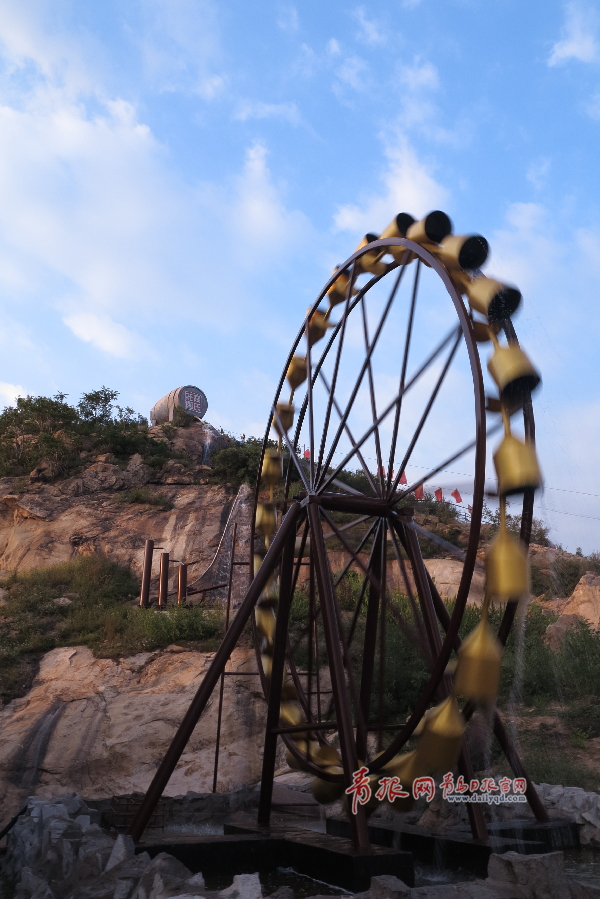 在菩山之上,有一個大木桶,木桶之內(nèi)的水經(jīng)過一個類似蹺蹺板似的小木筒,注入到一個山下大水車上的酒杯狀容器之內(nèi),水車不斷轉(zhuǎn)動,其上容器內(nèi)的水會被倒入水池之內(nèi)?!案呱搅魉钡木坝^令人印象頗為深刻。工作人員解釋稱,大水車中的水流過程模仿了葡萄酒的釀造過程。水車下的池子代表發(fā)酵池,葡萄酒經(jīng)過發(fā)酵后,通過管道送上山頂?shù)南鹉就斑M行陳釀,然后經(jīng)過過濾、定量灌裝,注入酒瓶之內(nèi),最后倒入水車內(nèi)的24個酒杯之中。