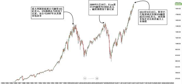 據(jù)MarketWatch報道,美國有分析師拋出言論,認(rèn)為美國股市歷史上最重要的頂部通常都伴隨著重要事件的發(fā)生,阿里巴巴上市后美國股市可能很快見頂。若持續(xù)時間長達(dá)五年半的美股牛市果真就此終結(jié),那么阿里巴巴創(chuàng)記錄規(guī)模的IPO將在歷史上寫下另一個注腳。