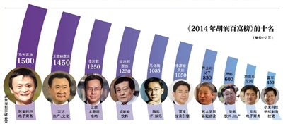 9月23日,胡潤(rùn)研究院發(fā)布2014百富榜,阿里巴巴創(chuàng)始人馬云及其家族以1500億財(cái)富首次成為中國(guó)大陸首富。前十富豪中IT業(yè)占一半,4名房地產(chǎn)富豪跌出前十榜單。