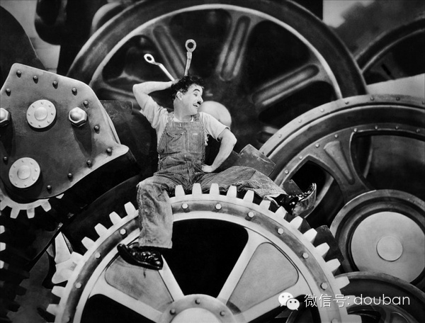 二十年代的美國(guó)處于經(jīng)濟(jì)蕭條時(shí)期,查理就是一個(gè)底層市民,他在一個(gè)機(jī)器隆隆的廠(chǎng)房里日以繼夜地工作,以賺取微薄的收入。重復(fù)繁重的工作壓得他喘不過(guò)氣,他把人們的鼻子當(dāng)成螺絲釘來(lái)擰,卷入流水線(xiàn)機(jī)器的皮帶里,令人苦笑不得。