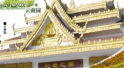 云南園的位置在世園會(huì)中可謂占盡了地利,因?yàn)樗挥谥腥A園主廣場(chǎng)的西邊,是來(lái)往人流較大的區(qū)域。聰明的云南人利用這地理優(yōu)勢(shì),蓋起了一座金碧輝煌的大牌坊,游客在很遠(yuǎn)的地方就能看到。這“牌坊”取材于云南當(dāng)?shù)氐膶m殿廟宇樣式,四層屋頂層層疊加,正中嵌著一只正在昂揚(yáng)遠(yuǎn)眺的孔雀。在世園會(huì)里與云南有關(guān)的建筑中,金色是不可或缺的元素。云南人為何如此鐘情于金色?記者查閱的資料中說(shuō),云南的傣族人很喜歡金子,認(rèn)為它能避邪驅(qū)鬼,所以連他們的扣飾也常常鍍上一層金色。