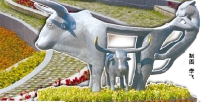 走進(jìn)園中,正中央擺放著一座名為“牛虎銅案”的雕塑。一只豹子模樣的動(dòng)物撕咬著一只大牛,而大牛肚子下方保護(hù)著一頭小牛。這?;~案是1972年在云南出土的戰(zhàn)國(guó)時(shí)期青銅器,它和“馬踏飛燕”一起并稱為二十世紀(jì)六七十年代最驚人的發(fā)現(xiàn),并有“北有馬踏飛燕,南有?;~案”之稱,同時(shí)也翻開(kāi)了古滇王國(guó)神秘面紗的一角。