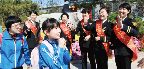 ????10月13日上午,來自青島市交運集團的五位勞動模范來到園區(qū)中,為青島市盲校學生和游客們進行志愿服務。身著工作裝,佩戴勛章和綬帶的她們英姿颯爽,笑容親切燦爛,為這個起風的日子帶來陣陣暖流。