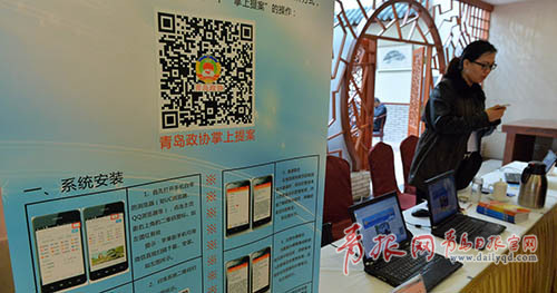 ????在會(huì)場(chǎng)一角,設(shè)置了一個(gè)“掌上提案”操作區(qū),這也是今年新增設(shè)的提案書寫提交方式。工作人員告訴記者,政協(xié)委員只要掃描一個(gè)二維碼即可下載“青島政協(xié)”客戶端,然后輸入相關(guān)身份信息驗(yàn)證,可登錄頁(yè)面?!霸谶@個(gè)頁(yè)面里可隨時(shí)寫提案,也可查閱往年的提案,避免了提案的重復(fù)。 ”圖/邢志峰