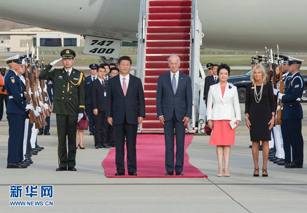 下午5時(shí)40分許,習(xí)近平乘坐的專機(jī)抵達(dá)華盛頓安德魯斯空軍基地。美國(guó)副總統(tǒng)拜登和夫人專程來(lái)到機(jī)場(chǎng),熱情歡迎習(xí)近平和夫人彭麗媛。美國(guó)兒童向習(xí)近平夫婦獻(xiàn)花。禮兵分列紅地毯兩側(cè)。軍樂(lè)隊(duì)奏響中美兩國(guó)國(guó)歌。