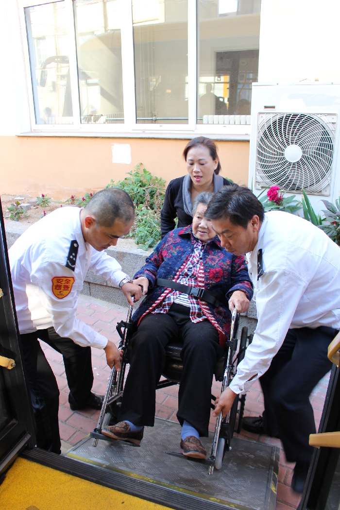 ??? 2015年10月25日,公交嶗山巴士公司501路線“我等您”愛(ài)心志愿服務(wù)團(tuán)隊(duì)積極開(kāi)展陪伴老人活動(dòng),車隊(duì)安排無(wú)障礙車放下踏板,志愿者把坐輪椅的老人推上車,送他們到室外享受島城自然美好景色,受到老人的感謝。