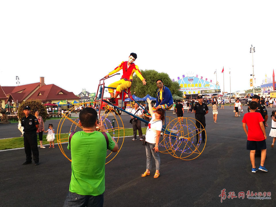 啤酒城里的馬戲表演吸引游客上前合影留念。