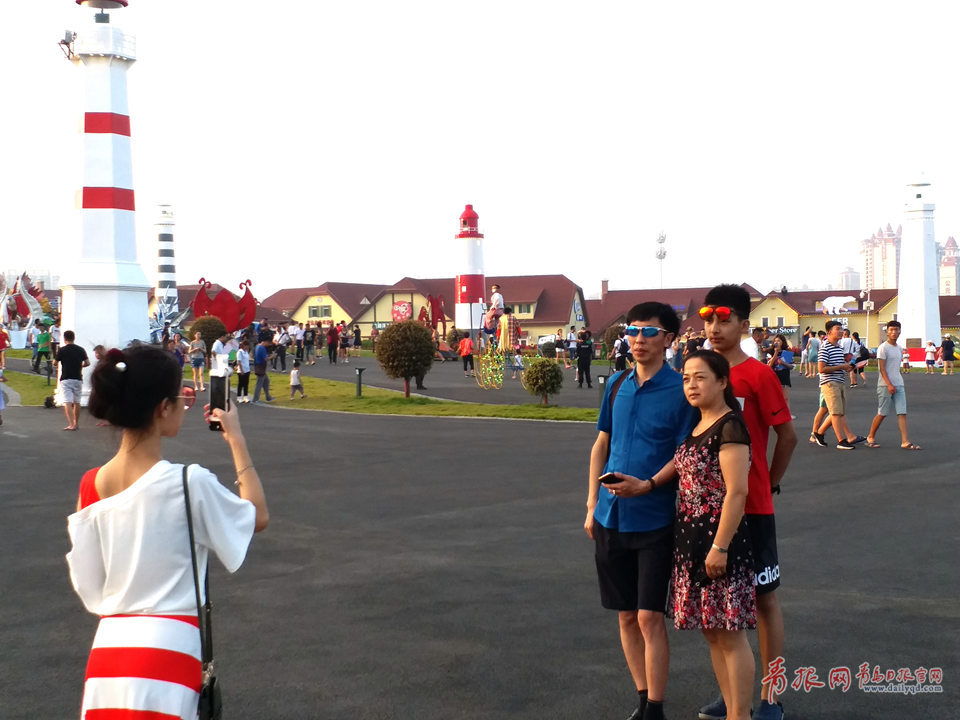 游客在啤酒城內(nèi)全家福合影。
