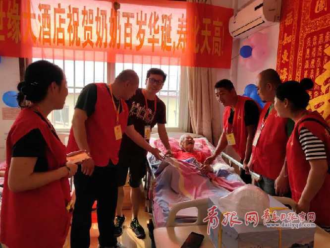 青島日報(bào)/青島觀/青報(bào)網(wǎng)訊7月5日上午,天氣高溫,酷暑氣候。位于我市西郊陳家屯村的高麗敬老院孟慶梅老人正逢100歲壽誕。得知這個(gè)好消息,我市紅十字會“幸運(yùn)草”志愿服務(wù)隊(duì)和好司機(jī)棒棒隊(duì)的志愿者們又一次來到了敬老院,和她的家人一起給老奶奶祝壽。