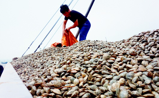 在交貨的時候,碼頭最為熱鬧。不少時候,蛤蜊產(chǎn)量滿足不了所有商販的要求。因為這種蛤蜊供不應求,市場需求量很大,“商販都是定了多少斤就要拿到多少斤,差個十斤八斤都不行?!惫ぷ魅藛T說,為了拿到足夠的蛤蜊,商販們看到漁船靠岸,會立即沖過去,用手畫個圈,就“定”下了幾大網(wǎng)兜蛤蜊;這時候不爭搶,就可能拿不到足夠的貨物,有時候商販之間畫圈有了交集,就要拼智力去爭取、拼體力把貨物裝進自家車里。