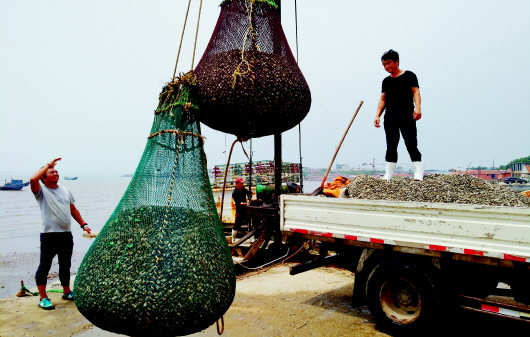 吊車將漁船上一兜又一兜的蛤蜊直接吊進碼頭上停靠的貨車里。