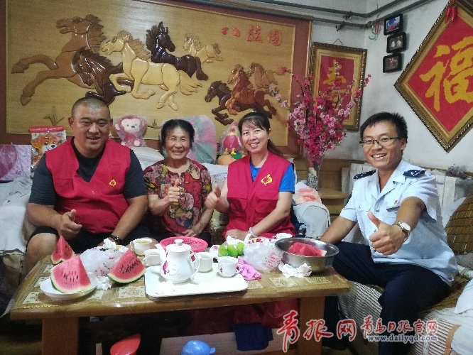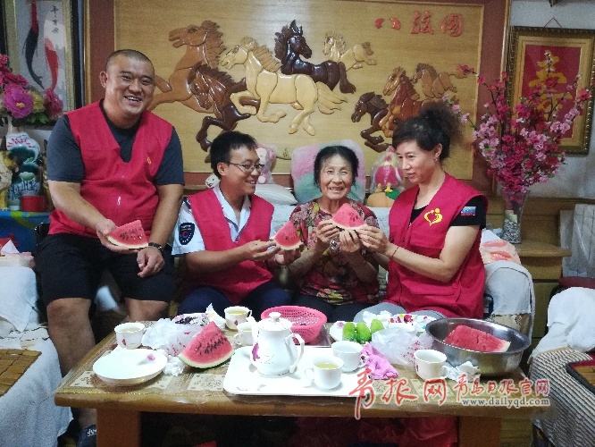 這是志愿者和老人結(jié)對的第四個年頭了,他們始終和老人相處的親如一家人。進屋后,喝著茶水,切開帶來的西瓜,享受著清涼,志愿者和老人談笑風生,老人關心著志愿者的工作和家庭,他們則關心著老人的身體狀況,叮囑老人天氣炎熱讓她盡量少出門別中暑,在家多熬綠豆湯,吃點容易消化的飯菜。一上午的時間志愿者和老人都很開心,其樂融融。