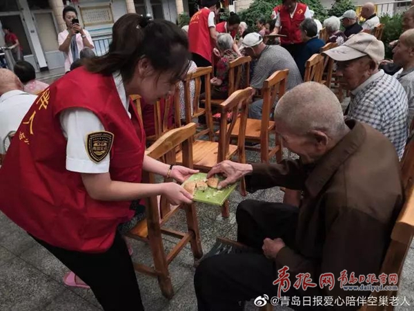 9月11日上午,在萊西市開發(fā)區(qū)夕陽紅養(yǎng)老院大廳內,39位老人與宣講團成員互動,聽著演講、唱著紅歌、嘗著月餅,志愿者與老人一起共慶祖國70華誕。