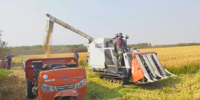 10月29日,隨著收割機駛?cè)氲咎?,河套街道趙家?guī)X社區(qū)喜開2019年水稻豐收“第一鐮”。在蔚藍的天空下,黃澄澄的稻田連成片,成熟的稻穗迎風(fēng)飄擺,村民正在趁著晴好天氣忙著收割旱水稻。