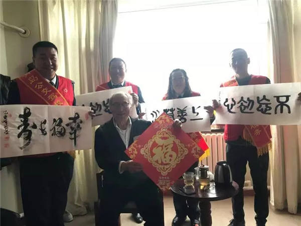 這邊老人與志愿者觀看節(jié)目嘮嗑,另一邊志愿者和工作人員一起動(dòng)手包餃子,人多力量大,五百多個(gè)餃子瞬間而出。當(dāng)熱騰騰的水餃端到老人房間時(shí),范大爺拿出自己親手寫的毛筆字送給志愿們表達(dá)他的感激之情。