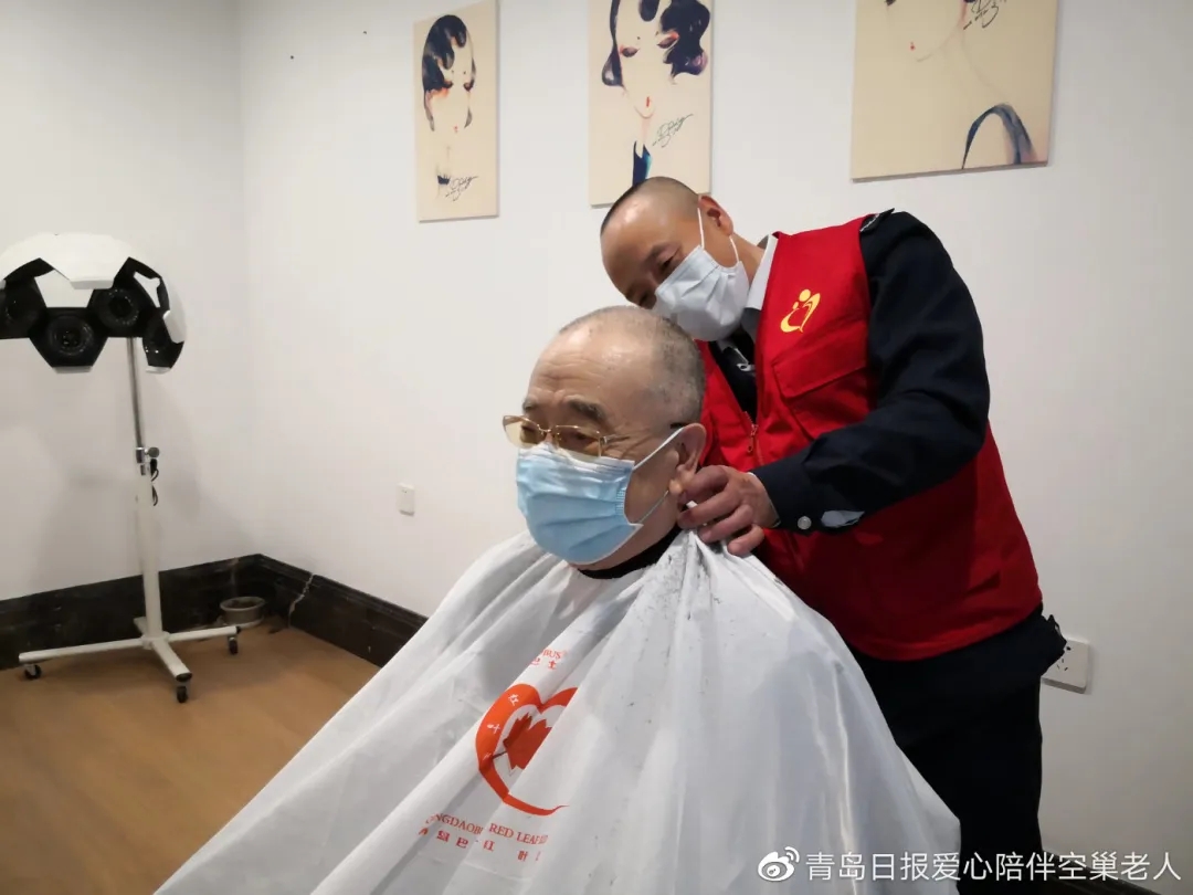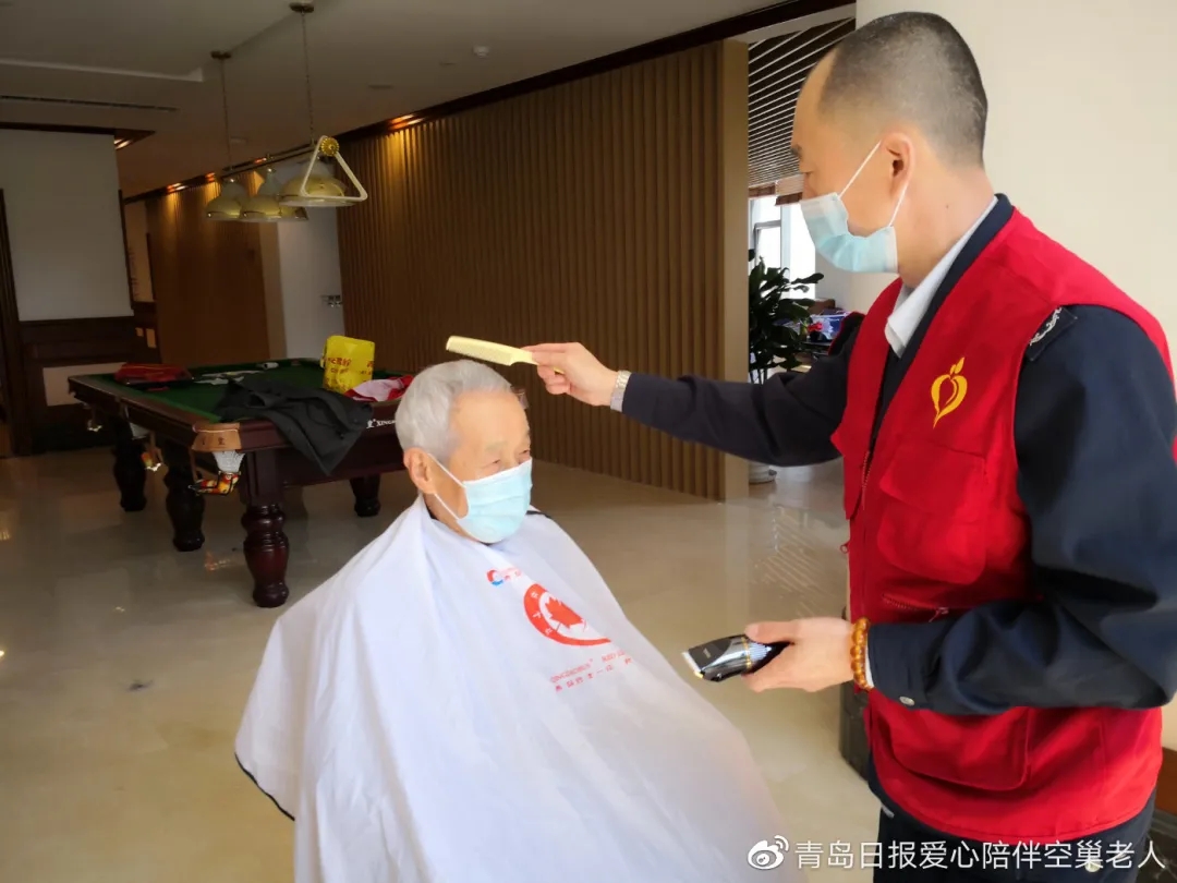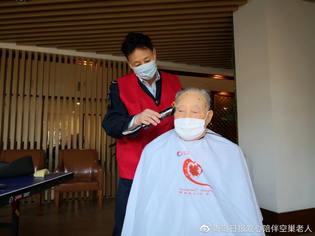 4月22日,“愛心陪伴”青島巴士“紅葉紅”義剪志愿者團隊的周剛、徐興波、于新基、盧明濤和胡曉雁來到親和源老年公寓為老人理發(fā)。