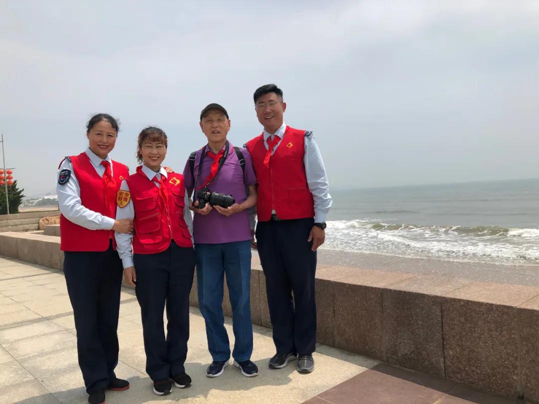 漫步在海邊的木棧道,志愿者陪著老人一起享受大自然的美景,愛心陪伴的紅馬甲也成為海邊一道靚麗的風(fēng)景。