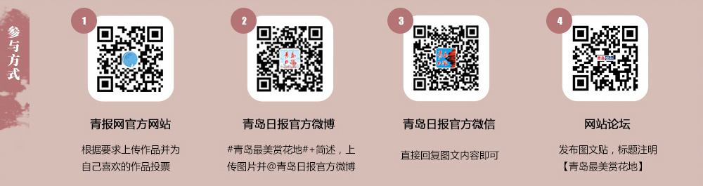 活動時間:2015.3.20——2015.5.30 主辦單位:市旅游局與青島日報、青報網(wǎng)、青島日報官方微博和微信 征集內(nèi)容: 1.偶然拍到的一組春花照片(需注明拍攝者、拍攝時間、地點和花名等) 2.賞花地點、賞花時間、賞花路線的推薦; 3.一篇賞花游記或小詩。