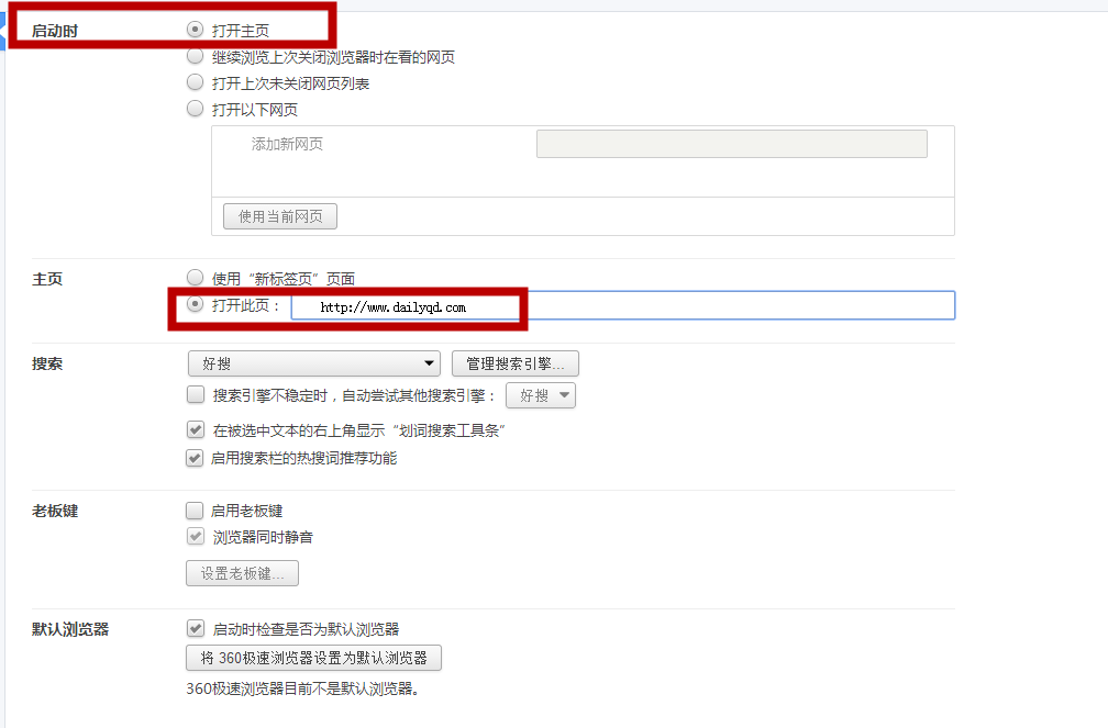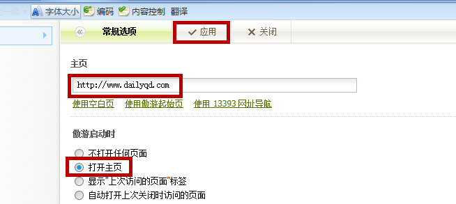 2.在"啟動時"項,確認點選"打開主頁"。在"主頁","打開此頁"項目后的框中輸入"http://m.xiaofei2008.com" ,設(shè)置成功。