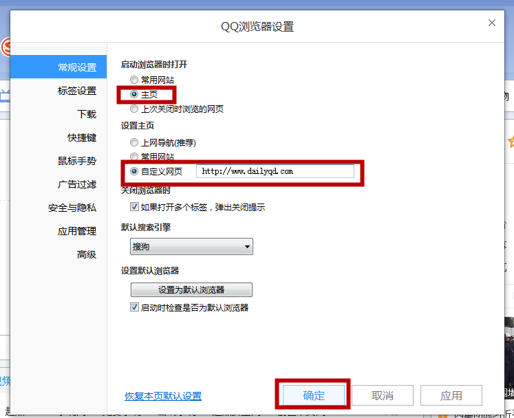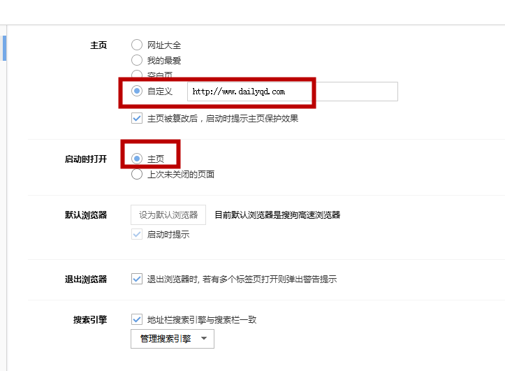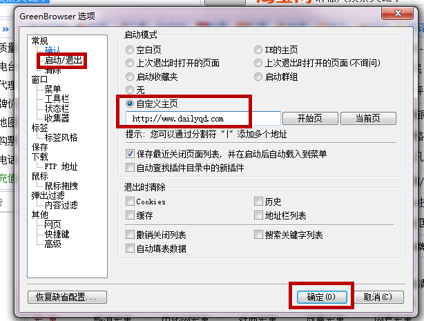 2.在左邊欄選擇"啟動/退出"項,點選"自定義主頁"并輸入"http://m.xiaofei2008.com",點擊確定,設(shè)置成功。